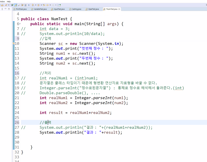 int realNum1 = (int)num1; 하면 오류 생김. 문자열은 클래스 타입이기 때문에 형변환 연산자로 자료형 바꿀수 없다..!