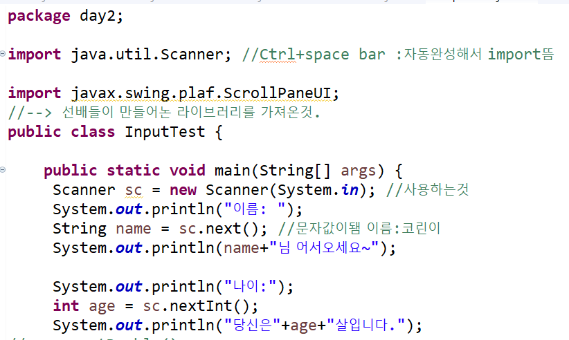 *Scanner라는 메소드를 쓸 때 import를 해서 라이브러리를 가져와야 한다. (Scanner sc 부분에 자동완성하면 같이 뜬다)