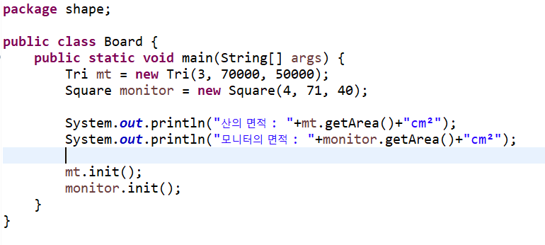예제 1. 산이랑(삼각형) 모니터(사각형) 으로 객체화하여 각각 넓이를 구하여라