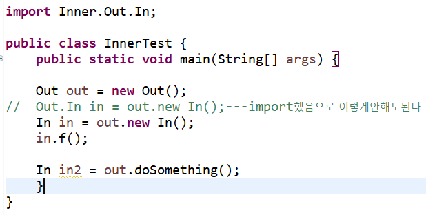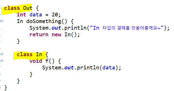 외부 클래스명 객체명 = new 외부클래스생성자(); <---1.외부클래스의 객체를 만든다(객체화하기전엔 내부클래스