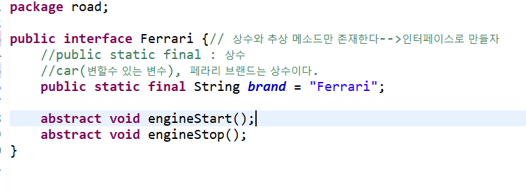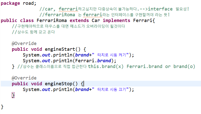 예제2. ferrari roma라는 차의 시동을 켜라 (implements , interface, abstract를 사용한다)