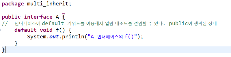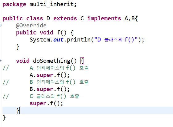 2.jdk 8버전 이후로부터는 인터페이스에 default 메소드를 선언할 수 있다. 따라서 사실상의 다중상속을 지원하게 된다.