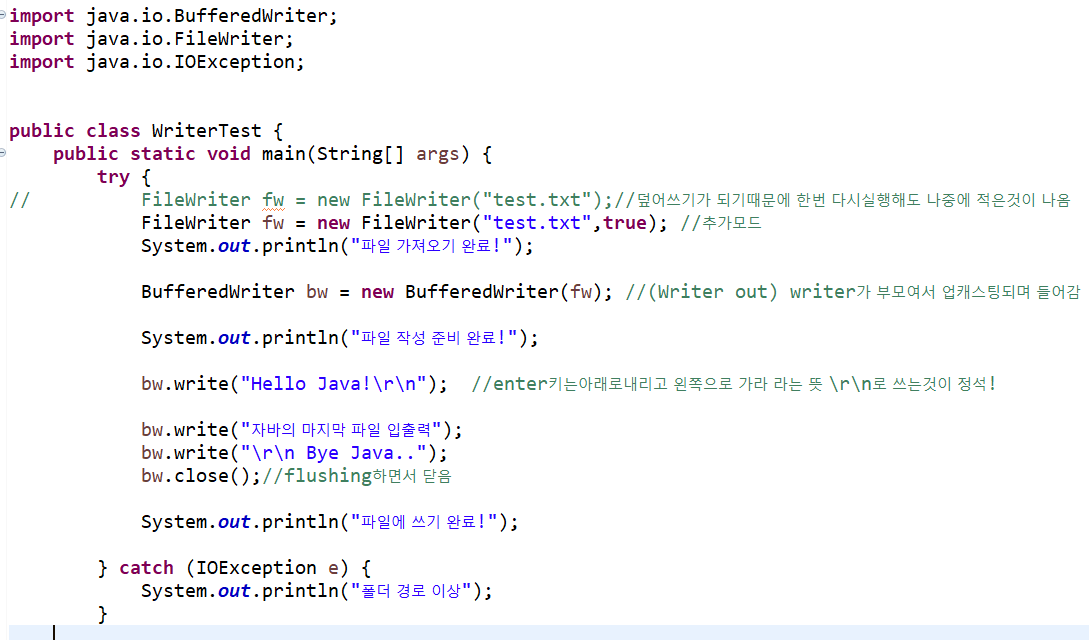 new FileWriter("파일경로") : 덮어쓰기 모드