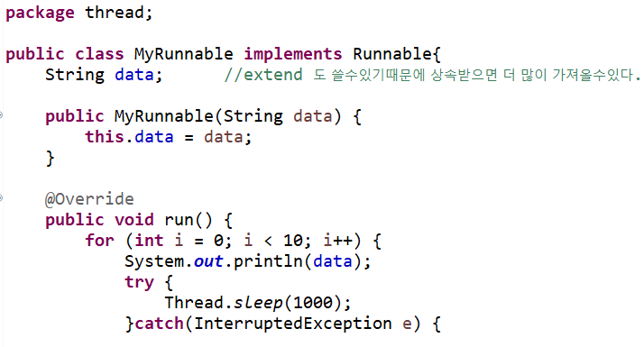 2. Runnable 인터페이스 지정 후 Thread 객체에 넘겨주기 (더 선호)