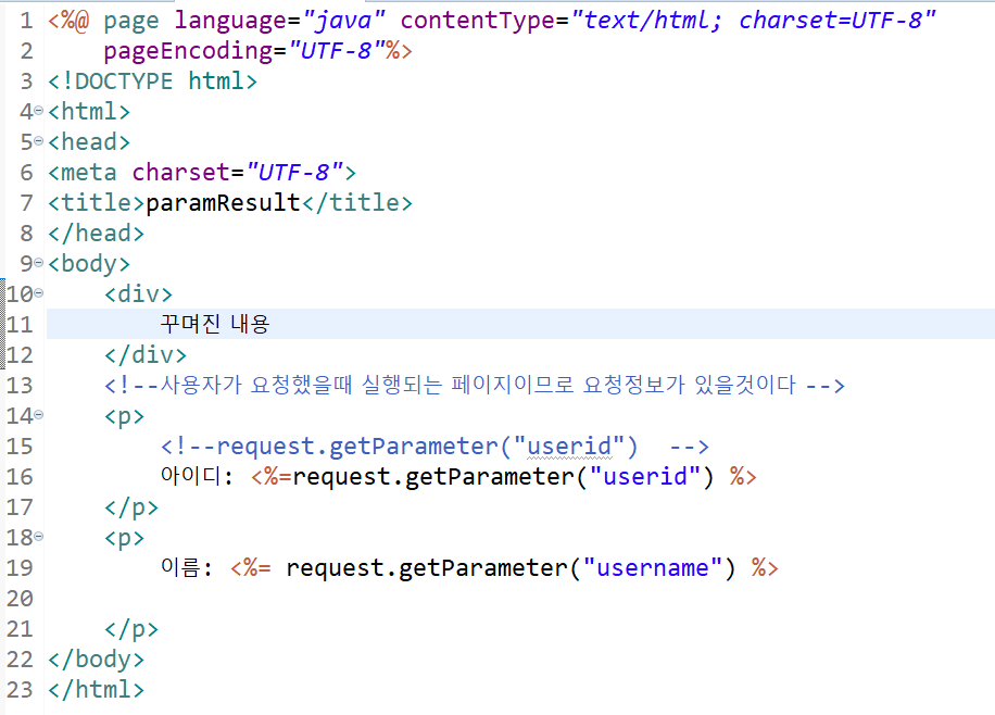 특정 파라미터(사용자가 입력한 값)는 요청을 통해 서버쪽으로 보내진다. 받는쪽에는 파라미터로 날라왔는데 파라미터중에 우리가 사용할 파라미터를 잘 골라서 써야하고 요청정보를 가져와서 처리한다. 다시 말하면, 페이지 이동(요청)시 사용자의 모든 정보를 가지고 있다. 그래야지 결과 페이지에서 정보받아서 처리를 해준다. 그래서 요청이라는 객체에 모든 정보담겨있게 되고 그걸 결과페이지에서 요청객체에서 정보를 꺼내는 코드를 써주어야한다.