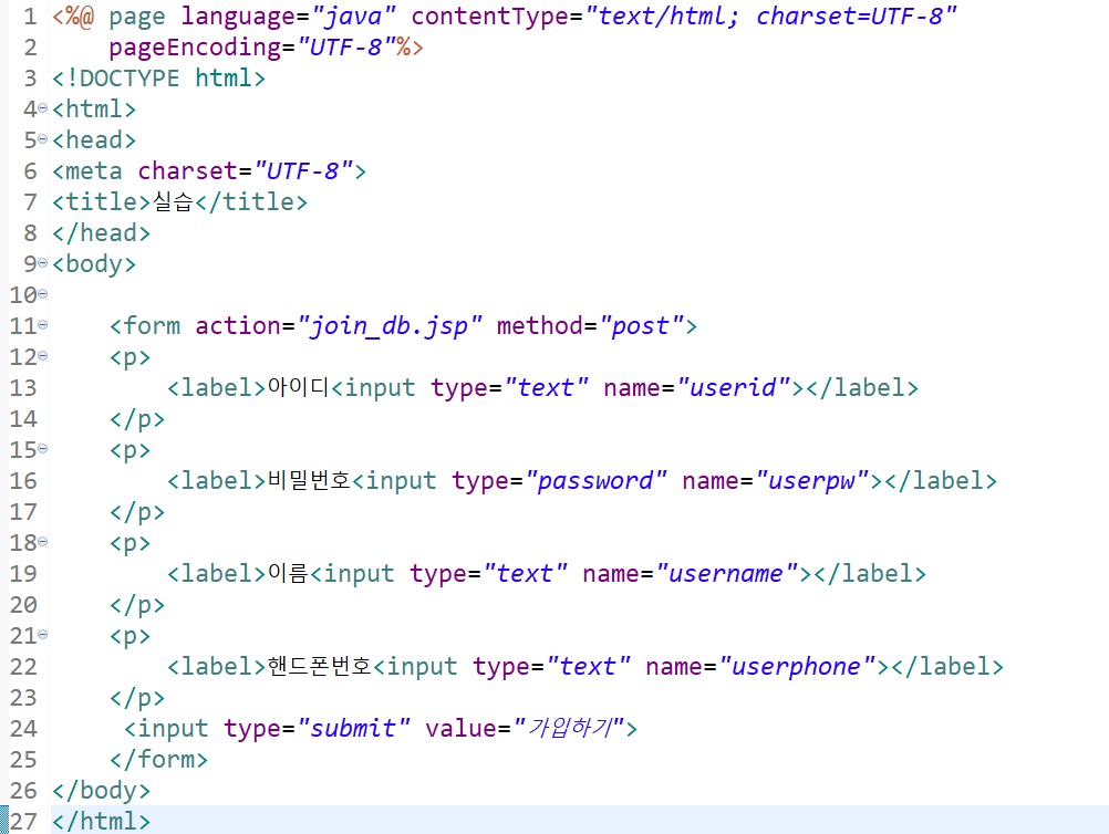 1.아이디,비밀번호,이름,핸드폰번호 입력받아서 "가입하기"버튼 클릭