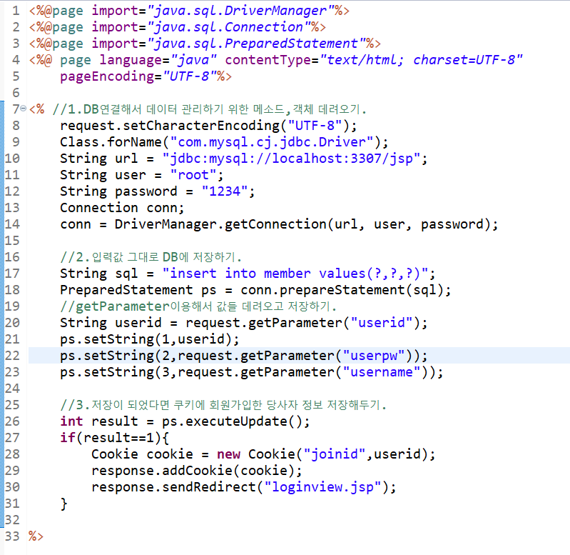 세번째로는, join_db.jsp 파일에 db를 직접 연결해주고 입력값을 DB에 저장해준다.
