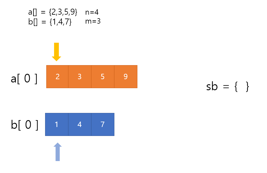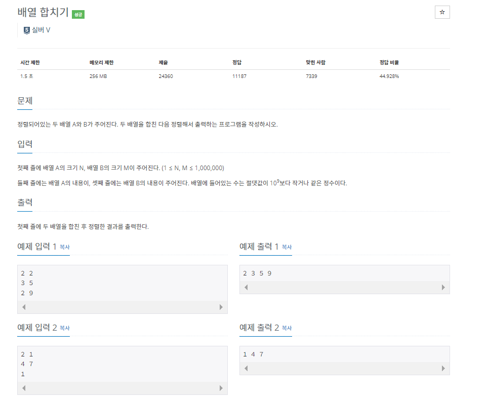 말 그대로 두개의 배열을 입력받아 정렬하여 결과를 출력하면 된다. 이 때 정렬하는 방법은 두가지가 있다. 첫번째는 Arrays.sort 메소드를 사용하고 두번째는 두포인터를 사용하는 것이다. 두가지 다 다뤄보겠다.