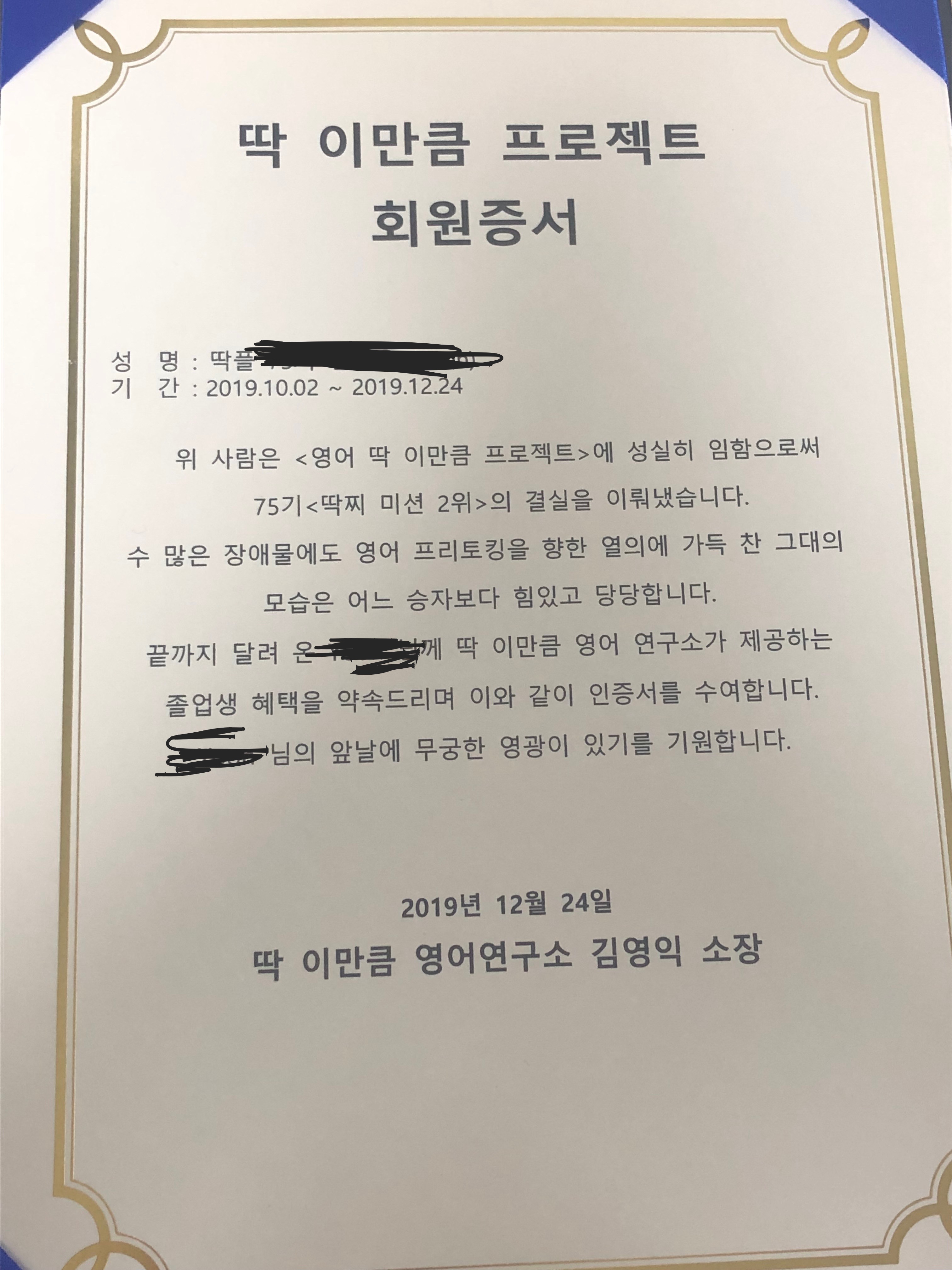 첫 번째로 난 영어에 대한 자신감이 필요하다고 생각하여 일이 끝나고 회화학원에 다녔다. 3개월을 첫 번째 회화학원을 다녔는데 Basic Grammer in Use 를 활용하여 매일매일 페어와 함께 연습했다. 일이 끝나고 과제를 해야 하는데 너무 피곤해서 자지 않기 위해 나의 직장에서 역까지 걸어 다니면서 (거의 30분 거리) 외웠던 기억이 난다. 결국 이 학원에서 좋은 성적으로 졸업하게 되었고 영어로 말하는 것이 더 이상 두렵지 않았고 재밌었다. 두 번째 회화학원도 5개월 정도 다녔는데 엄청 재미있었던 기억이 난다. 숙제도 어마 무시했지만 한번 입이 트이고 나니 재미있어서 새벽을 새더라도 꾸준히 다 해갔던 기억이 난다.