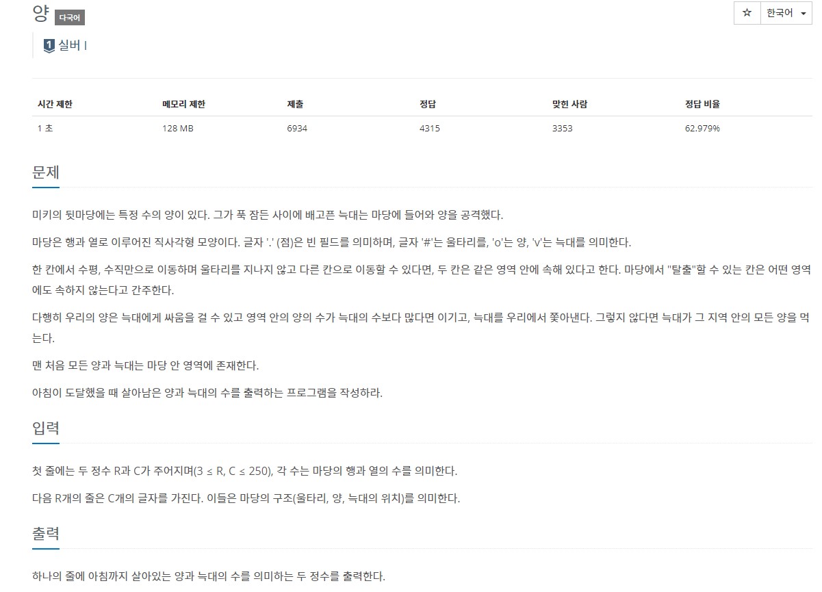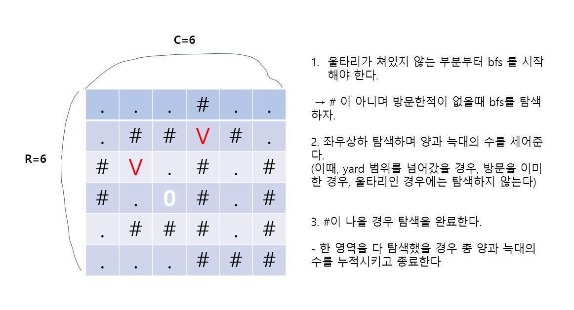- 다른 그래프 문제와의 차이를 보자면, 늑대와 양의 수를 매번 확인해야 한다.